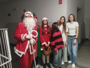 W pierwszym tygodniu grudnia do internatu przybył święty Mikołaj w asyście pomocników. Nasz gość spotkał się z wychowankami, aby zgodnie z tradycją obdarować ich słodyczami. Podczas jego wizyty odbył się quiz mikołajkowy, którego laureaci otrzymali pamiątkowe dyplomy oraz upominki. Było wesoło i już dało się poczuć atmosferę świąt. Mamy nadzieję, że Mikołaj odwiedzi nas także w przyszłym roku.
